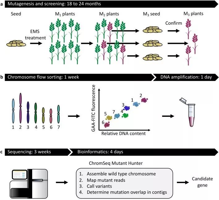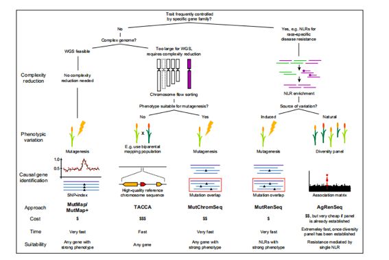 TILLING,即Targeting Induced Local Lesions IN Genomes(定向誘導基因組局部突變技術),是由Steven Henikoff領導的研究小組發(fā)展起來的,TILLING技術借助高通量的檢測手段,快速有效地從由化學誘變劑(EMS)誘變過的突變?nèi)后w中鑒定出點突變。目前此技術廣泛應用于作物研究中,另外還有基因全基因組重測序的MutMap和MutMap +方法,實現(xiàn)功能基因的快速定位。MutRenSeq和MutChromSeq也應用于突變基因定位,2016年John Innes Centre組織利用EMS誘變產(chǎn)生的小麥突變體,使用液相捕獲技術,通過特異性的RNA捕獲探針對目標區(qū)域進行富集,二代測序后,通過比對野生型和抗性突變體的序列,找到了目標抗性基因。MutChromSeq在此基礎上進行改進,利用流式細胞儀技術將含目標基因的單條染色體分離出來,后期結(jié)合高通量測序,通過比較突變體及野生型的差異,快速克隆基因,此方法大大降低重測序的難度,減少了其它染色體序列對目標序列的影響。