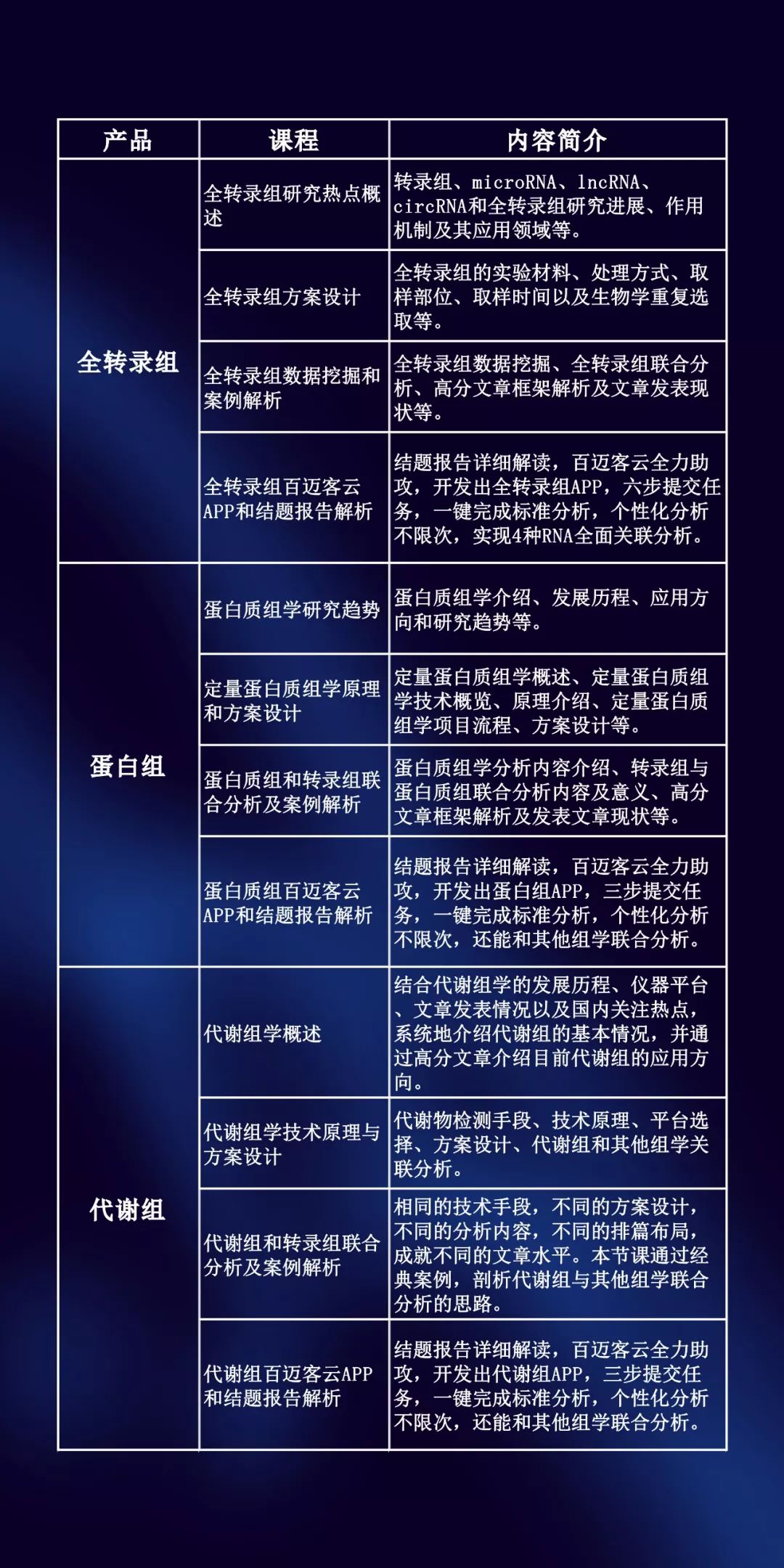 本次課程包含全轉(zhuǎn)錄組、蛋白質(zhì)組和代謝組,共計(jì)12課時(shí),具體課程如下: