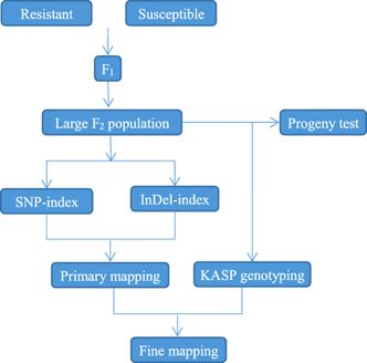 ? ? ? 本研究采取一種新的組合策略(圖1.),即兩步信息分析SNP-index與InDel-index共定位,結合KASP標記分型精細定位,快速定位到特定性狀候選基因,為克隆Cf-10基因以及分子標記輔助育種提供一條強力有效的途徑。