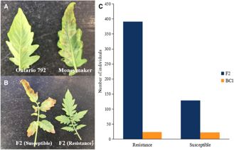 為考察Cf-10的遺傳基礎,作者對品種Ontario 792,Moneymaker及其F1,F(xiàn)2與BC1F1群體的抗病能力進行評估。結果顯示,品種Moneymaker對10種病菌生理小種表現(xiàn)敏感,而Ontario792均表現(xiàn)顯著抗病能力,暗示Ontario792對番茄葉霉病菌具有廣譜抗病能力;所有F1代個體均表現(xiàn)抗病,F(xiàn)2代抗病與感病個體呈現(xiàn)3:1分離比,暗示Cf-10受顯性單基因控制,并且BC1F1的表型分離比驗證了這一結果(圖2.)。
