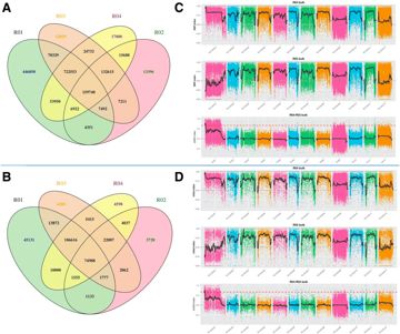 圖3. SNP/InDel統(tǒng)計及BSA分析. A. SNP統(tǒng)計;B. InDel統(tǒng)計;C. SNP-index分析;D. InDel-index分析
