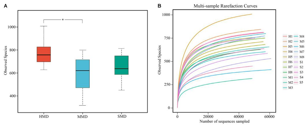 1、結(jié)果16S-rRNA基因測序結(jié)果分析從8個(gè)HMD,8個(gè)MMD和5個(gè)SMD糞便樣品中獲得總共1,165,731個(gè)高質(zhì)量序列,并且從每個(gè)樣品獲得48,489-61,048個(gè)分析序列(平均長度= 406.3bp)。HMD,MMD和SMD中觀察到的物種(OTU)顯示在圖1A中,每個(gè)樣品的平均OTU數(shù)為675±160。本研究中檢測到的數(shù)量表明物種的數(shù)量隨著測序深度的增加而增加。稀釋曲線的末端隨著每個(gè)樣品的序列數(shù)量的增加而逐漸減少(圖1B)。得到的OTU在Silva數(shù)據(jù)庫中進(jìn)行比對注釋,最后得到的細(xì)菌主要分為16門,26類,43目,63科和160屬。結(jié)果表明,健康麝的腸道微生物具有較高的細(xì)菌多樣性,而腹瀉麝的細(xì)菌多樣性較低。因此,腸道微生物中細(xì)菌物種的豐富性和多樣性是“健康”的重要組成部分,它們在維持腸道微生態(tài)系統(tǒng)的動(dòng)態(tài)平衡和確保正常生理功能方面有重要作用。