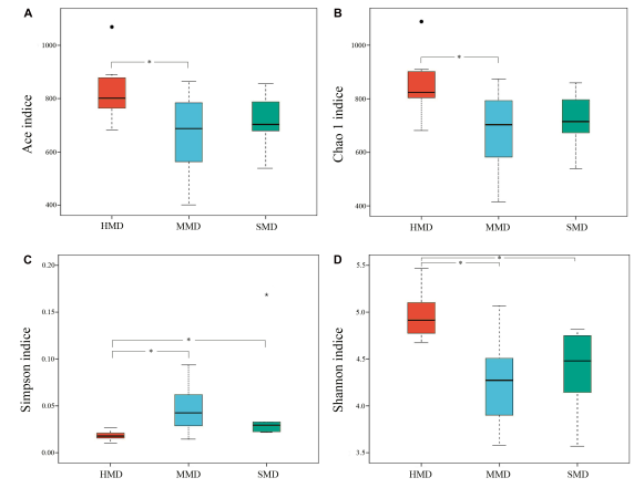 麝鹿糞便樣本中Alpha多樣性指數(shù)(Ace,Chao 1,Simpson和Shannon)(圖2)和健康和腹瀉的樣本β多樣性指數(shù)統(tǒng)計(jì)結(jié)果顯示:HMD和MMD之間的Ace、Chao 1、Simpson和Shannon指數(shù)存在顯著差異(P <0.05)。MMD和SMD之間沒有顯著性差異。HMD和SMD的比較發(fā)現(xiàn)有顯著性差異(P <0.05)。