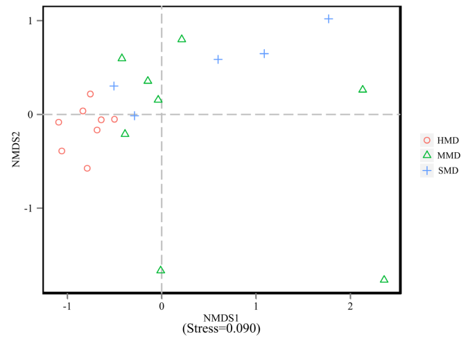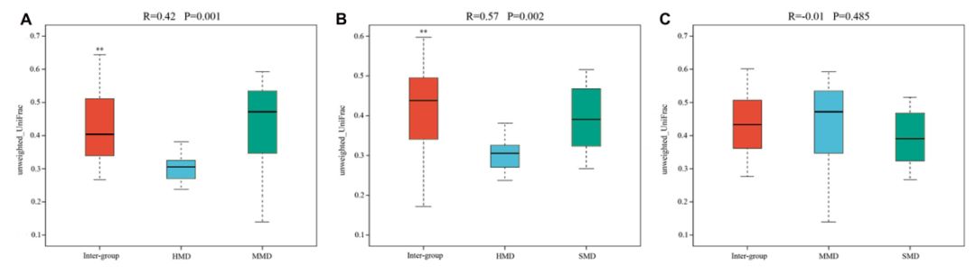 組間和組內(nèi)β距離在箱型圖中顯示(圖4),結(jié)果表明HMD和MMD組(圖4A)之間以及HMD和SMD組之間細(xì)菌群落的極顯著差異(圖4B)(?P <0.01)。