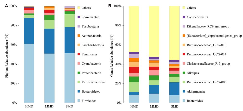 1、試驗(yàn)材料:選擇了4-6歲的成年森林麝鹿,包括8只健康麝(HMD)(編號H1-H8),8只輕度腹瀉麝(MMD)(編號M1-M8),和5只嚴(yán)重腹瀉的麝(SMD)(編號S1-S5)。共收集了21份糞便樣本。2、試驗(yàn)方法:Illumina HiSeq 2500?,16SV3+V4