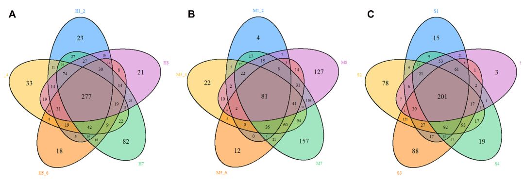 物種分類柱狀圖是表示HMD、MMD和SMD樣本中物種的組成及對應(yīng)物種在該樣本中的相對豐度。HMD、MMD和SMD樣本中在門水平和屬水平相對豐度前10的物種如圖5所示。無論是否存在腹瀉的樣本中,厚壁菌和擬桿菌都是主要的優(yōu)勢菌。然而,健康森林麝的糞便中厚壁菌的相對豐度明顯高于腹瀉麝。厚壁菌是構(gòu)成食物中纖維素分解代謝并將纖維素降解為宿主揮發(fā)性脂肪酸的主要細(xì)菌類型。此外,厚壁菌門還可以調(diào)節(jié)體內(nèi)免疫反應(yīng),抑制病原體的侵襲和預(yù)防腸道炎癥。腹瀉麝腸道中厚壁細(xì)胞豐度的減少可能會同時(shí)降低該物種的消化生理功能。另外,β多樣性的比較顯示,健康和腹瀉森林麝的細(xì)菌群落差異極顯著,這與麝的異常消化生理功能有關(guān)。HMD、MMD和SMD三組不同樣本之間共有OTU和特有OTU數(shù)量如圖6所示。