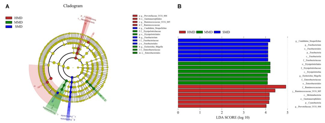 LefSe分析表明(圖7),在屬的水平上,MMD組與HMD和SMD組之間顯著性差異較大的菌種為埃希氏菌?–?志賀氏菌。埃希氏菌屬?–?志賀氏菌是常見的病原體,其主要的傳播途徑包括:受感染對象的糞便、食物和含有細(xì)菌的水。該病原體可引起結(jié)腸粘膜炎癥,導(dǎo)致腹痛、腹瀉和形成粘膜糞便等癥狀。因此,用于喂養(yǎng)麝的食物和水以及糞便管理是減輕輕度腹瀉的關(guān)鍵。另外,SMD組與HMD和MMD組之間顯著性差異較大的菌種為梭桿菌。梭桿菌是炎癥性微生物,它可抑制體內(nèi)T細(xì)胞應(yīng)答并促進(jìn)炎性因子的表達(dá)。比較MMD組和SMD組,可以推測Fusobacterium可能在輕度腹瀉的背景下增殖并成為主要病原體。因此,森林麝的腸道生理紊亂與其主要病原體的類型是存在一定的相關(guān)性的。
