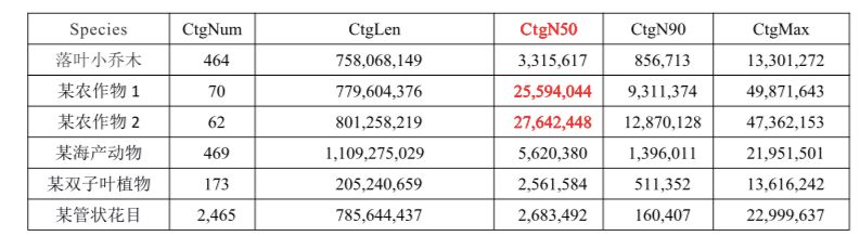 ContigN50是衡量基因組組裝好壞的一個(gè)重要指標(biāo),一定程度上來(lái)說(shuō),contigN50值越高表示組裝的質(zhì)量越好。組裝數(shù)據(jù)表中,ONT的組裝數(shù)據(jù)中contigN50水平均在1 Mb以上(測(cè)序深度的高低會(huì)有一定的影響,為了更好組裝指標(biāo),一般建議進(jìn)行100X以上),雜合度高的物種組裝結(jié)果同樣會(huì)略遜色于其它簡(jiǎn)單物種。相較之前最強(qiáng)水產(chǎn)組裝結(jié)果(N50>22 Mb),ONT作物組裝N50最高值再創(chuàng)新高,達(dá)到了27 Mb?。?span style="color: #3366ff;">數(shù)據(jù)評(píng)估結(jié)果點(diǎn)擊查看)不管大家怎么看,反正小編被如此高的指標(biāo)深深的震撼了,希望技術(shù)團(tuán)隊(duì)再接再厲,創(chuàng)造新的記錄!