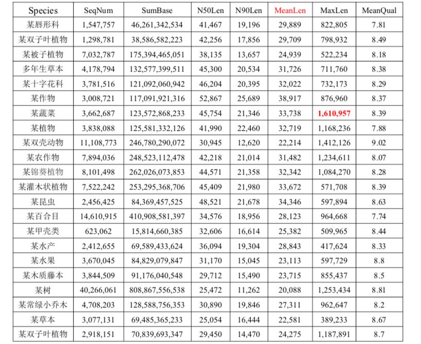 注:Species:分析的物種信息;SeqNum:各個(gè)長(zhǎng)度范圍內(nèi)序列的數(shù)目;SumBase:指各個(gè)長(zhǎng)度范圍內(nèi)序列的總長(zhǎng)度;N50Len:reads N50長(zhǎng)度;N90Len:readsN90長(zhǎng)度;MeanLen:平均reads長(zhǎng)度;MaxLen:最長(zhǎng)reads長(zhǎng)度;MeanQual:質(zhì)量值,準(zhǔn)確度=1-10^(-Q/10)。
