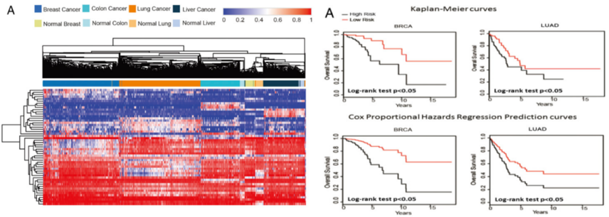 從TCGA中常見癌癥(肺癌、乳腺癌、結(jié)腸癌、肝癌)的甲基化數(shù)據(jù)中篩選癌癥標(biāo)記物,這些標(biāo)記物能非常準(zhǔn)確的(準(zhǔn)確度95%)區(qū)分開癌組織和正常組織。同時他們發(fā)現(xiàn)DNA甲基化模式可以預(yù)測預(yù)后和生存。