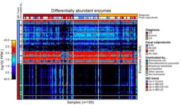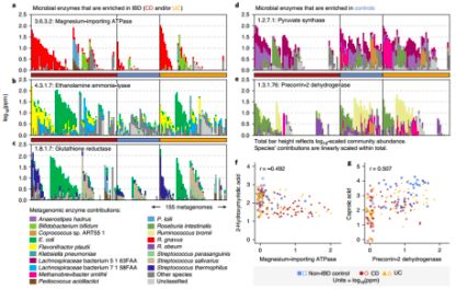 基于線性模型分析IBD微生物組的酶功能(EM)。與對照組相比,568種酶的豐度在UC或CD患者中差異顯著(FDR,q<0.05)(圖8.),其中246種酶不受任何單一菌種支配。UC和CD患者均富集有鎂離子轉(zhuǎn)運ATP酶(EC 3.6.3.2)(圖9.a)和乙醇胺氨裂合酶(EC 4.3.1.7)(相對于對照組)(圖9.b),而乙醇胺氨裂合酶與甘油磷脂的合成有關(guān),后者在UC和CD患者的代謝物中富集最多(圖3.a)。谷胱甘肽還原酶(EC 1.8.1.7)在IBD患者中也有較高豐度(圖9.c);丙酮酸合成酶(EC 1.2.7.1)在對照組中富集,在CD患者中完全未檢測到(圖9.d);維生素B12(如前咕啉,EC 1.3.1.76)在對照組含量較高(圖9.e)。四吡咯可能是維生素B12的衍生物和相關(guān)化合物,它在LC-MS代謝組分析中普遍存在,并且在IBD患者中富集(圖4.b)。