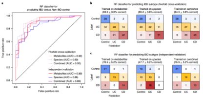 最后,本研究從代謝物、微生物菌“種”及兩者組合水平訓練“隨機森林”(RF)分類器,鑒定IBD病癥和IBD子集,受試者工作曲線(ROC)描繪RF分類器的假陽性率和準確率,混合矩陣評估PRISM隊列IBD子集RF分類器。結(jié)果顯示,所有RF分類器對IBD患者和健康人群的辨識效果良好,AUC值為0.86-0.92,交叉驗證結(jié)果(AUC:0.90-0.92)更優(yōu)于獨立驗證結(jié)果(AUC:0.86-0.89)(圖10.a)。PRISM隊列中,代謝物、微生物菌“種”及兩者組合水平預測UC、CD和健康人群的準確率為64-65%,該結(jié)果雖然不如案例/對照成功,但仍高于隨機預測(正確率:30%)(圖10.b),將PRISM訓練IBD子集RF分類器應用于荷蘭人群時(用于人類疾病驗證),輸入數(shù)據(jù)類型之間差異較大(圖10.b)。