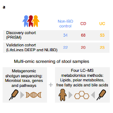1.? 樣本收集(糞便):①PRISM(麻省總院IBD前瞻注冊試驗):CD患者(68例),UC患者(53例),健康人群組(34例)(Fig. 1a);②LifeLines DEEP和NLIBD(荷蘭北部人群前瞻研究,用于人群疾病的驗證):CD患者(20例),UC患者(23例),荷蘭北部健康人群(22例)(圖1.a)。