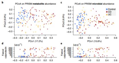 本研究從155例(PRISM)樣本中共檢測出8,000多種代謝物,這些代謝物在健康人群與CD患者之間差異較大,UC患者的代謝物與健康人群和CD患者均有一定程度相似(圖1.b)。糞便樣品中的鈣保護素與代謝物、菌群結(jié)構(gòu)變化的第一主軸(PCoA)相關(guān)性均較強(圖1.d.1e),UC患者的炎癥程度既與健康人群相似又與CD患者相似,表明UC患者之間的腸道菌群結(jié)構(gòu)與代謝組份差異較大。