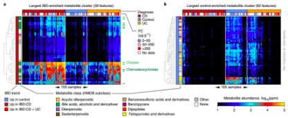 (圖2:IBD代謝物豐度熱圖,圖中顯示了2729種IBD(UC/CD)與健康組之間具有豐度差異的特征代謝物)