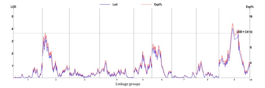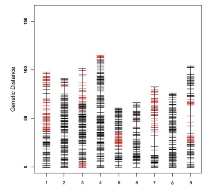 開發(fā)了185,349個(gè)SLAF標(biāo)記,其中,20,250個(gè)SLAF標(biāo)記可以成功分型,最終上圖的標(biāo)記為4787個(gè),分布于9個(gè)LG中,構(gòu)建一張平均圖距為0.22cM的遺傳圖譜(如下圖),標(biāo)記間最大gap超過10cM,這可能是由于小孢子培養(yǎng)構(gòu)建DH群體的過程中,可能某種基因型更容易形成胚胎和再生植株,從而產(chǎn)生偏分離或某段染色體區(qū)域中無個(gè)體發(fā)生重組。