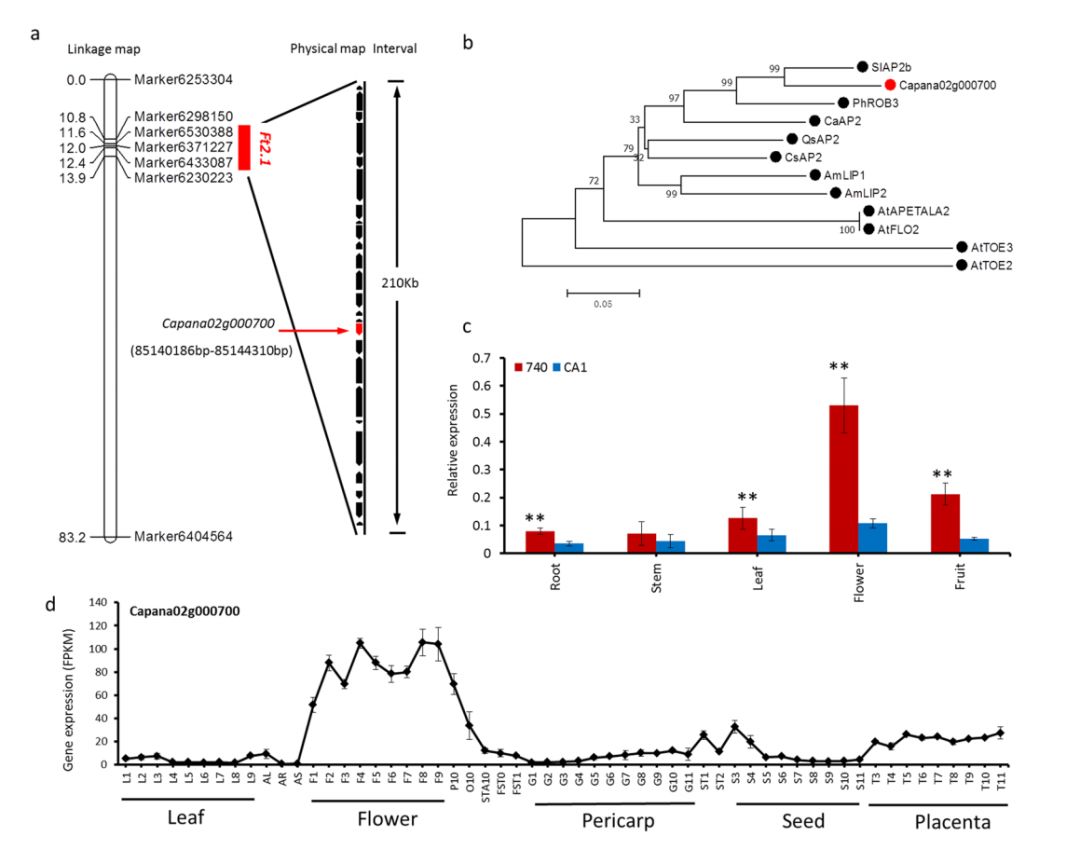 花期相關(guān)基因:針對主效QTL——Ft2.1進(jìn)行重點(diǎn)分析,它處于遺傳圖譜上的區(qū)間為0.763cM,對應(yīng)的Zunla-1基因組上物理區(qū)間為210Kb,包含25個(gè)基因,其中存在之前鑒定到的Capana02g000700基因,編碼花器官同源異型蛋白。進(jìn)化分析表明Capana02g000700的同源基因,金魚草LIP1和LIP2、擬南芥APETALA2和辣椒CaAP2,均在花器官發(fā)育階段存在重要作用。同時(shí),比對雙親間序列差異,發(fā)現(xiàn)8個(gè)SNP標(biāo)記和1個(gè)6bp的InDel標(biāo)記,這導(dǎo)致親本CA1存在2個(gè)氨基酸的缺失和5個(gè)氨基酸的改變。繼DNA層面分析之后,RNA層面的分析qRT-PCR和RNA-seq表明,這個(gè)基因在雙親間存在差異表達(dá),且在花器官中表達(dá)量最高,最終認(rèn)為Capana02g000700就是控制花期的候選基因。