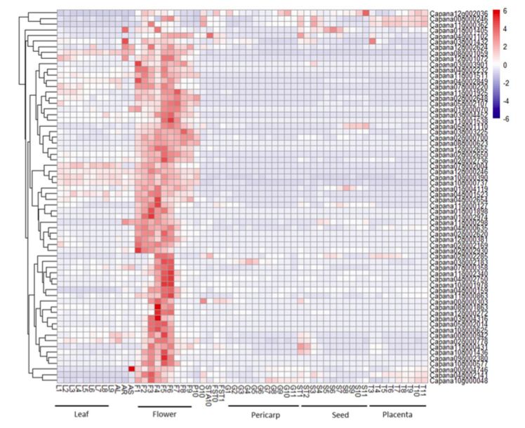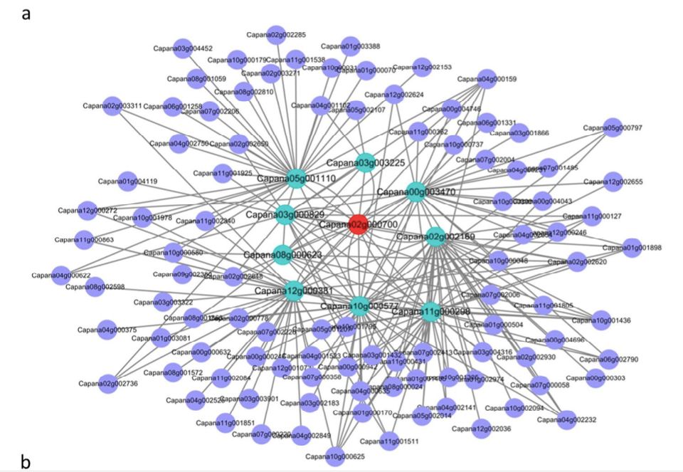 利用之前研究的不同發(fā)育階段和不同組織部的WGCNA分析結(jié)果,找到了花器官發(fā)育特定模塊,其中包含107個(gè)基因。這些基因中10個(gè)為TFs,其中就包含已鑒定的Capana02g000700,這表明這些TFs可能與花發(fā)育的轉(zhuǎn)錄調(diào)控相關(guān)。這107個(gè)基因中,發(fā)現(xiàn)9個(gè)基因與Capana02g000700高度共表達(dá),分為3個(gè)家族,且其功能均與花發(fā)育相關(guān)。上述,均表明Capana02g000700通過抑制靶基因和/或TF表達(dá)來控制花器官發(fā)育,進(jìn)而影響花期。