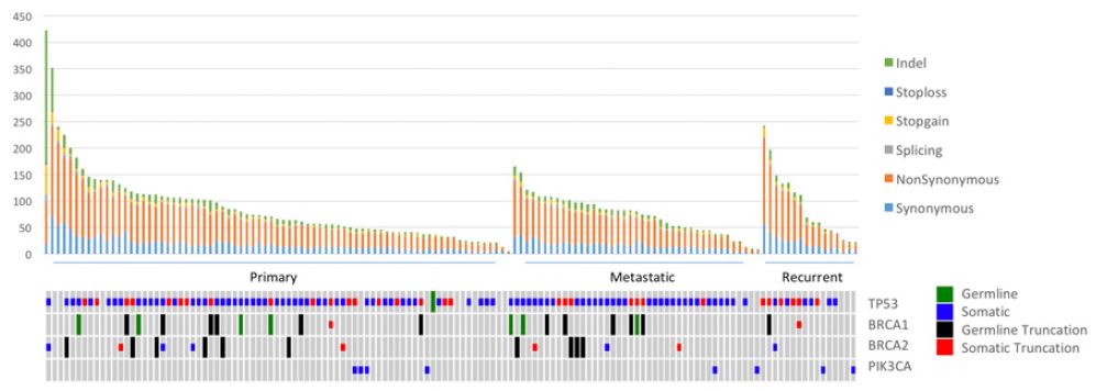 1、研究者通過全外顯子組測序(WES)分析了來自77名單側(cè)卵巢癌患者的122例新鮮凍存腫瘤組織(64個原發(fā)灶,41個轉(zhuǎn)移灶和17個復(fù)發(fā)灶,其中原發(fā)灶中含有分別與轉(zhuǎn)移灶和復(fù)發(fā)灶相匹配的樣本)以及匹配的正常DNA(來自靜脈血等)的突變情況。