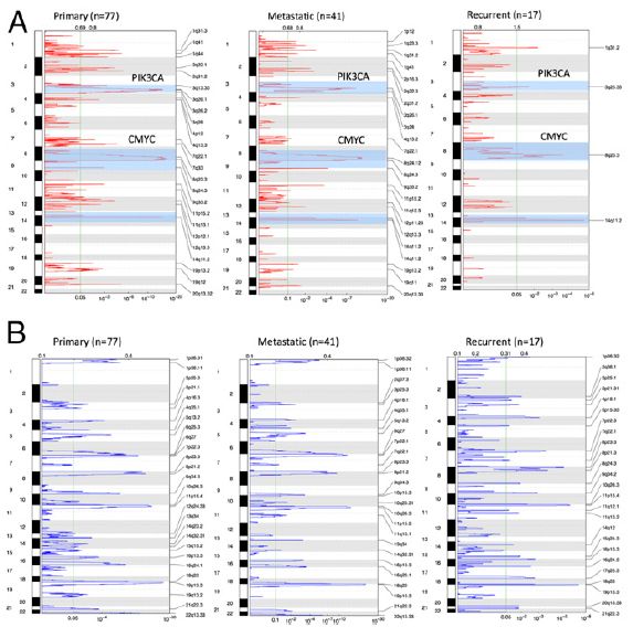 成對外顯子測序數(shù)據(jù)SCNA分析表明,在原發(fā)灶與復(fù)發(fā)灶匹配的17名患者中,4名患者獲得了PIK3CA擴增(3q26),2名患者在復(fù)發(fā)腫瘤中獲得了c-MYC擴增(8q23-24)。GISTIC分析表明,PIK3CA和c-MYC擴增在樣本間具有顯著重現(xiàn)性,其頻率在復(fù)發(fā)灶、轉(zhuǎn)移灶和原發(fā)灶依次降低。