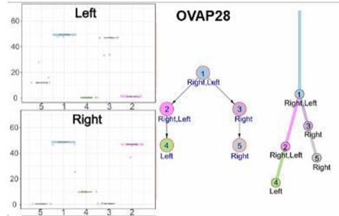 2、研究者也對13對雙側(cè)卵巢癌(synchronous bilateral ovarian cancer,SBOC)進行了測序,評估腫瘤克隆進化,以確定左右兩側(cè)腫瘤是否獨立地作為2個不同的腫瘤,還是分別代表原發(fā)性和轉(zhuǎn)移性腫瘤。分析表明,體細胞突變在2側(cè)腫瘤廣泛共享,所有病例中均顯示2側(cè)腫瘤起源于共同的祖先。