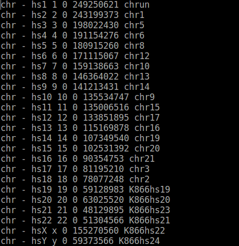 Circos圖可以展示數(shù)據(jù)在染色體上的分布情況,首先我們需要一個染色體的信息文件,畫出染色體的圈,該信息由circos.conf的karyotype參數(shù)進(jìn)行設(shè)置,如下圖: