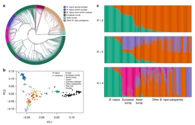 甘藍型油菜(Brassica napus,2n=4x=38,AACC)是一種重要的異源多倍體作物,其來自于白菜型油菜(Brassica rapa,2n=2x=20,AA)和甘藍(Brassica oleracea,2n=2x=18,CC)的種間雜交。然而,真正的野生B. napus群體尚不清楚,其起源和改良過程仍不清楚。在本研究中,研究人員利用重測序的方法對588份甘藍型油菜(Brassica napus)進行測序,揭示了A亞基因組可能從歐洲蕪菁的祖先進化而來,而C亞基因組可能是從大頭菜,花椰菜,西蘭花和中國羽衣甘藍的共同祖先進化而來。此外,冬季油籽型可能是歐洲油菜的原始形式。防御反應相關(guān)基因在亞基因組上的特異性選擇有助于物種形成后的環(huán)境適應性,而不對稱的亞基因組選擇導致生態(tài)型的變化。通過結(jié)合全基因組關(guān)聯(lián)分析(genome-wide association studies),群體選擇分析及轉(zhuǎn)錄組分析,研究人員鑒定了與提高的脅迫耐受性,含油量,種子質(zhì)量和生態(tài)型改良相關(guān)的基因,這些基因成為甘藍型油菜(Brassica napus)進一步功能鑒定和遺傳改良的候選基因組。