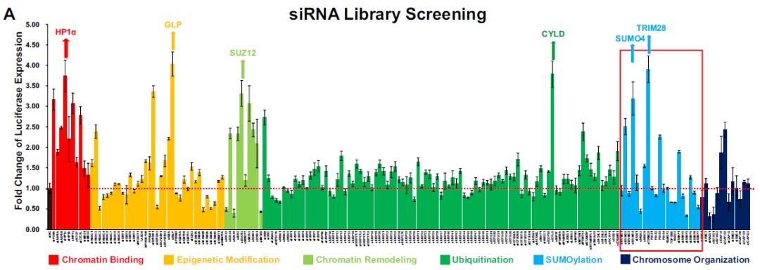 為了確定可能導(dǎo)致HIV-1抑制和潛伏的細(xì)胞靶點(diǎn),作者定制了siRNA文庫(kù)在ZM-bl細(xì)胞系中進(jìn)行高通量篩選,該文庫(kù)靶向細(xì)胞核內(nèi)的幾種細(xì)胞途徑的182個(gè)基因,包括chromatin binding, epigenetic modification, chromatin remodeling, ubiquitination, SUMOylation 和 chromosome organization。分析敲除各靶標(biāo)基因后熒光素酶的表達(dá)水平變化(以siNC為對(duì)照),許多蛋白質(zhì)對(duì)應(yīng)的熒光素酶表達(dá)升高,表明這些蛋白限制HIV-1啟動(dòng)子的活性,最明顯包括HP1α、GLP、SUZ12和CYLD,其已被鑒定為抑制HIV-1轉(zhuǎn)錄。其中,兩個(gè)較少見的SUMO化途徑基因TRIM28和SUMO4敲低后,顯著上調(diào)了HIV-1啟動(dòng)子活性。