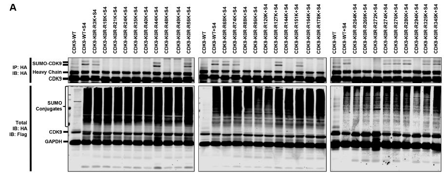 接下來(lái)作者試圖鑒定應(yīng)該在CDK9?賴氨酸殘基上發(fā)生的SUMO化位點(diǎn)。賴氨酸突變實(shí)驗(yàn)結(jié)果:CDK9-K0R突變體含有所有賴氨酸變?yōu)榫彼岬耐蛔?,完全中止了CDK9被SUMO化的能力;其他CDK9突變體仍然能夠通過(guò)TRIM28進(jìn)行SUMO化,這表明在整個(gè)CDK9序列中可能存在多個(gè)SUMOylation位點(diǎn)。采用基于CDK9-K0R全突變體的逆轉(zhuǎn)突變策略,發(fā)現(xiàn)CDK9上的幾個(gè)賴氨酸顯著SUMO化。其中,多個(gè)SUMO化位點(diǎn)與CDK9 C-末端自身磷酸化位點(diǎn)相鄰,據(jù)報(bào)道這些位點(diǎn)是Tat-P-TEFb與TAR RNA高親和力結(jié)合所必需的,即?SUMO化可以通過(guò)阻止相鄰的磷酸化來(lái)降低結(jié)合能力。