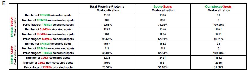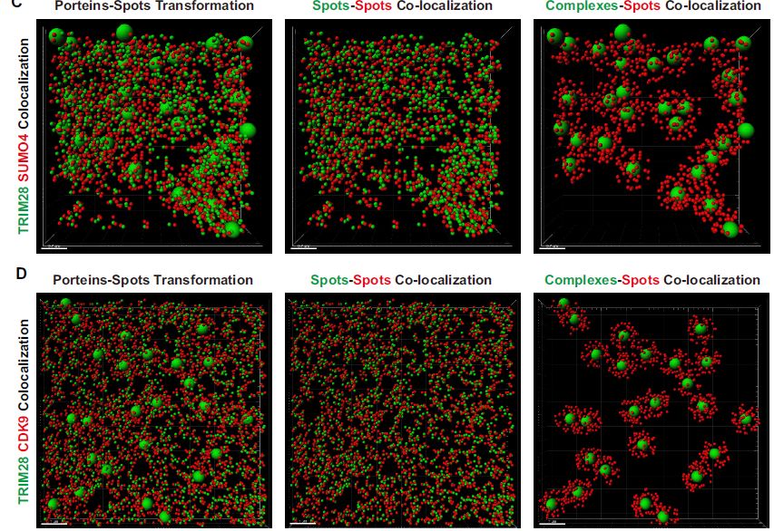 為了確定TRIM28是否與CDK9結(jié)合,作者使用超分辨率的連續(xù)隨機(jī)光學(xué)重建顯微鏡(cSTORM)來(lái)研究分辨率為20nm二者間的三維(3D)共定位。TRIM28存在于細(xì)胞核中,與點(diǎn)狀SUMO4共定位。放大視圖和3D-cSTORM,發(fā)現(xiàn)SUMO4蛋白被TRIM28富集并形成大斑點(diǎn)。CDK9存在于細(xì)胞核內(nèi)的分散點(diǎn)中,但仍發(fā)現(xiàn)CDK9與TRIM28共定位。與SUMO4類似,CDK9蛋白被TRIM28富集并包圍TRIM28。近80%的TRIM28斑點(diǎn)或復(fù)合物與94%的SUMO4斑點(diǎn)共定位,88%的TRIM28斑點(diǎn)或復(fù)合物與76%的CDK9斑點(diǎn)共定位。