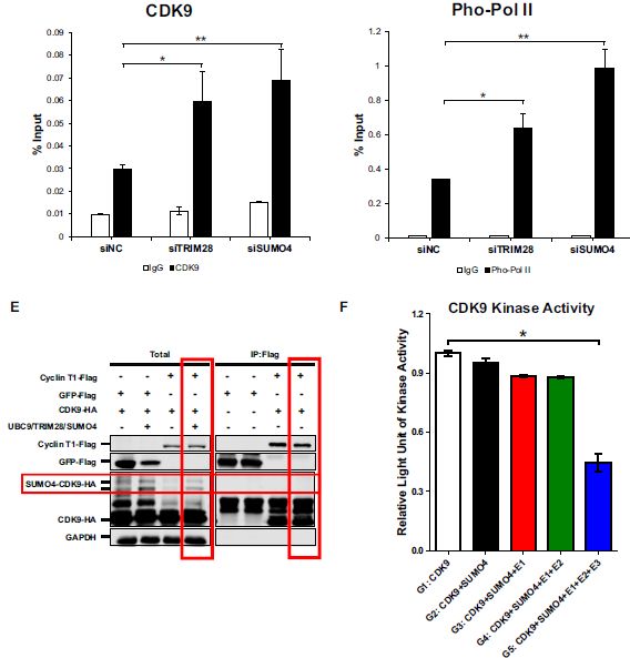Co-IP實(shí)驗(yàn)發(fā)現(xiàn)細(xì)胞周期蛋白Cyclin T1僅與野生型CDK9結(jié)合形成正性轉(zhuǎn)錄延伸因子P-TEFb復(fù)合物,而不是SUMO化的CDK9。為了研究TRIM28介導(dǎo)的CDK9 SUMO化是否影響CDK9的激酶活性,進(jìn)行了體外CDK9 SUMO化測(cè)定和CDK9激酶活性測(cè)定:發(fā)現(xiàn)當(dāng)TRIM28 SUMO化CDK9時(shí),CDK9的激酶活性顯著降低。不添加TRIM28,CDK9的激酶活性不受影響,盡管已添加其他SUMO化組分。