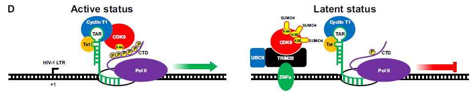 Ma X, Yang T, Luo Y, et al. TRIM28 promotes HIV-1 latency by SUMOylating CDK9 and inhibiting P-TEFb.Elife. 2019 Jan 17;8. pii: e42426.
