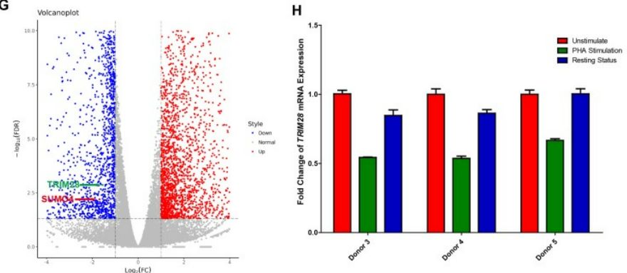 通過(guò)實(shí)驗(yàn)發(fā)現(xiàn)si-TRIM28過(guò)表達(dá)抑制了HIV-1啟動(dòng)子活性的基礎(chǔ)水平,并以劑量依賴的方式挽救了HIV-1抑制;當(dāng)與HIV-1 Tat和TNFα組合過(guò)表達(dá)時(shí),上調(diào)更顯著;TRIM28在多種細(xì)胞系和原代細(xì)胞中普遍表達(dá)。為搜索HIV-1潛伏相關(guān)基因,作者利用RNA-Seq比較未刺激和PHA刺激的原代CD4+?T細(xì)胞中的基因表達(dá)作為補(bǔ)充實(shí)驗(yàn),TRIM28在未刺激的原代CD4+?T細(xì)胞中高表達(dá),并在PHA激活后下調(diào)。當(dāng)活化的CD4+?T細(xì)胞恢復(fù)到靜止?fàn)顟B(tài)時(shí),TRIM28的表達(dá)再次上調(diào)。為了測(cè)試TRIM28是否有助于HIV-1潛伏,在HIV-1潛伏細(xì)胞系J-Lat 10.6以及其他HIV潛伏細(xì)胞系模型(J-Lat 6.3/8.4/9.2和15.4)中敲低了TRIM28,發(fā)現(xiàn)TRIM28的缺失上調(diào)了HIV-1的表達(dá)。此外,當(dāng)補(bǔ)充廣泛定義的LRA:組蛋白去乙?;福℉DAC)抑制劑SAHA或BET結(jié)構(gòu)域抑制劑JQ-1時(shí),HIV-1重新激活增強(qiáng)得更高。