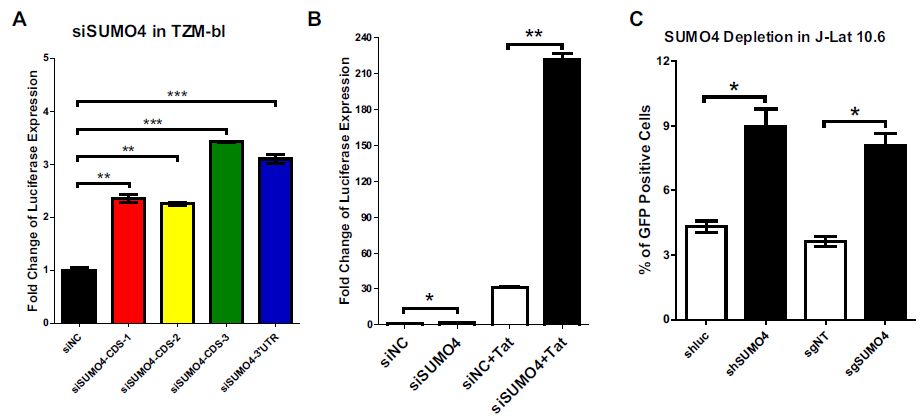前面siRNA文庫(kù)篩選中,SUMO4缺失比其他SUMO旁系同源物缺失更顯著上調(diào)HIV-1啟動(dòng)子活性。當(dāng)與HIV-1 Tat過(guò)表達(dá)組合時(shí),上調(diào)更顯著,其現(xiàn)象與TRIM28實(shí)驗(yàn)中觀察到的相似。SUMO4的敲低或敲除也能夠在J-Lat 10.6中重新激活潛在的假HIV-1。原代CD4+?T細(xì)胞被PHA刺激后,SUMO4的表達(dá)下調(diào),恢復(fù)到靜止期后達(dá)SUMO4表達(dá)恢復(fù)到基礎(chǔ)水平。