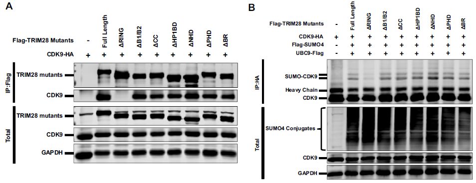 免疫共沉淀(Co-IP)實(shí)驗(yàn)發(fā)現(xiàn)即使在RNase存在下CDK9也與TRIM28結(jié)合。為了鑒定TRIM28的哪個(gè)區(qū)域與CDK9結(jié)合,構(gòu)建各種TRIM28缺失突變體以富集CDK9:RING結(jié)構(gòu)域缺失中止了CDK9的結(jié)合以及CDK9的SUMO化。實(shí)驗(yàn)表明外源表達(dá)的TRIM28也與CDK9共定位??傊?,研究表明RING和PHD都具有E3連接酶活性并富集UBC9。
