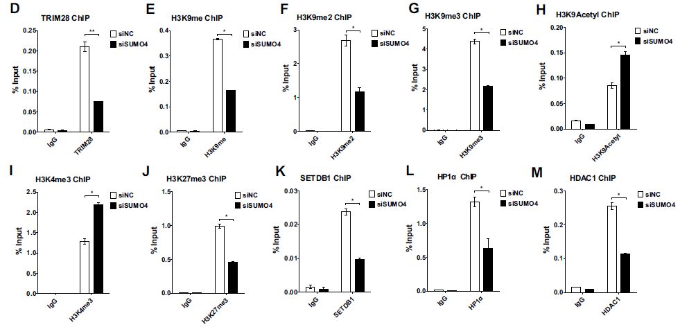接下來(lái)探究了SUMO4是否可以影響TRIM28的功能和HIV-1啟動(dòng)子的表觀遺傳狀態(tài):SUMO4敲低后,超過(guò)一半的TRIM28從HIV-1 LTR中丟失,表明TRIM28在HIV-1 LTR上的富集可能是部分SUMOylation依賴性的;SUMO4敲低后H3K9me、H3K9me2和H3K9me3在HIV-1 LTR上顯著降低,以及H3K9甲基化’writer’ SETDB1和’reader’ HP1α顯著降低;H3K9乙?;虷3K4me3的顯著上調(diào)和HDAC1的下調(diào),這與先前報(bào)道TRIM28以SUMO化依賴性方式募集SETDB1、HP1α和HDAC1一致;H3K27me3在HIV-1 LTR上也降低。一些多梳抑制復(fù)合物2(PRC2)組分如EZH2和SUZ12(H3K27me3的主要’writer’)可能被SUMO4 SUMO化,導(dǎo)致修飾功能的增強(qiáng)。