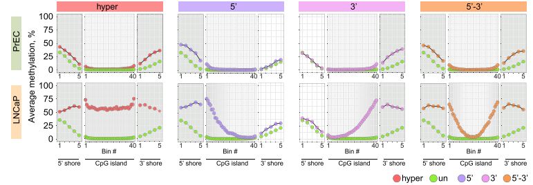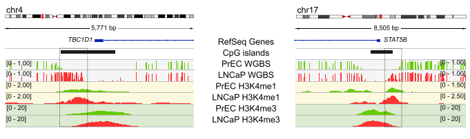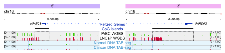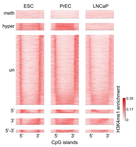 采用chip-seq數據,分析H3K4me1在癌癥CpG島超甲基化中的富集方式。H3K4me1高富集于hESCs CpG島的body區(qū),在癌癥中呈現(xiàn)廣泛超甲基化。相反,癌癥中未甲基化的CpG島,在hESCs中表現(xiàn)為邊界雙峰富集及島區(qū)域降低。并且,文章發(fā)現(xiàn)一種hESCs中不對稱的H3K4me1富集模式,在對應5’或3’內CpG島邊界,易于癌癥中DNA甲基化。通過可視化圖展現(xiàn)了候選的CpG島,顯示癌癥中5’和3’的甲基化堆積,可以由正常前列腺細胞中H3K4me1預先標記。