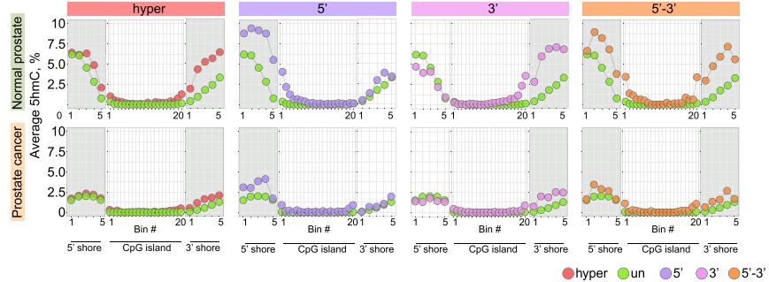 文章結果發(fā)現(xiàn)在5’或3’不對稱甲基化的CpG島邊界,正常細胞中具有高甲基化,但廣泛甲基化的或雙向甲基化堆積的CpG島在island shores具有高甲基化水平。正常組織中5hmC對DNA去甲基化及未甲基化CpG島的保護具有重要作用。此外癌組織中5hmC大范圍的減少可能會參與CpG島的超甲基化。文章采用3對前列腺癌樣本進行5hmC與5mC檢測,正常組織中表現(xiàn)出增強的CpG島shores 5hmC水平,且基因CpG島DNA甲基化堆積伴隨shores處5hmC的降低。