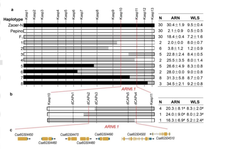 本研究利用SLAF-BSA技術(shù),將黃瓜耐澇基因定位在301kb區(qū)間內(nèi)(初定位群體為949株,選擇50+50的混池),針對定位區(qū)間的SLAF標簽的SNP信息設(shè)計KASP標記和dCAPS標記,并對6691個F2子代和6個F2:3家系進行分型,結(jié)合重組個體基因分型和表型數(shù)據(jù),將ARN6.1定位在36.1kb的范圍內(nèi),后期結(jié)合轉(zhuǎn)錄組,找出候選基因CsARN6.1。