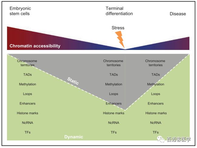 作者以此研究為基礎(chǔ),結(jié)合前人研究結(jié)果,構(gòu)建了發(fā)育和疾病發(fā)生中表觀基因組的變化模型(如下圖)。發(fā)育過程中伴隨著染色質(zhì)的變化,使最終分化的細(xì)胞具有穩(wěn)定的轉(zhuǎn)錄組,而疾病破壞了這種平衡,通過影響染色質(zhì)結(jié)構(gòu)、增強(qiáng)子-基因loop、組蛋白修飾、DNA甲基化等,將基因組的特定區(qū)域轉(zhuǎn)變?yōu)楦鼊?dòng)態(tài)的構(gòu)象。