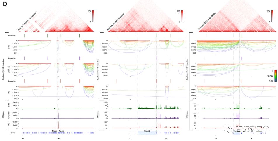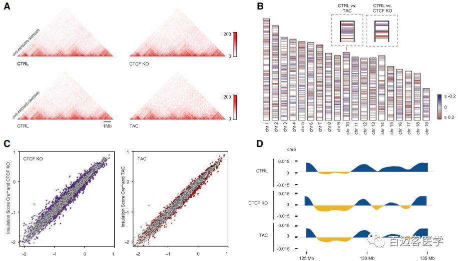 正常對(duì)照成年小鼠(CTRL)和兩個(gè)不同的疾病模型(TAC、CTCF-KO)小鼠的Hi-C結(jié)果揭示了5 kb分辨率下心肌細(xì)胞的基因組相互作用,得到了染色體內(nèi)和染色體間的互作事件,并為未來的心臟表觀基因組研究提供了依據(jù)。壓力超載或CTCF缺失選擇性地改變了TAD的邊界強(qiáng)度和A/B?compartment、基因組可及性。心力衰竭涉及致病基因周圍染色質(zhì)互作穩(wěn)定性的降低。此外,壓力超負(fù)荷或CTCF缺失重塑了心臟增強(qiáng)子的長(zhǎng)距離互作,導(dǎo)致這些功能元件周圍局部染色質(zhì)互作顯著減少。