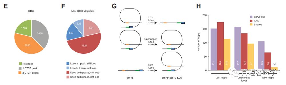 CTCF-KO、TAC小鼠的染色體長(zhǎng)距離loop大小沒有明顯變化,但loop總數(shù)量減少。相比于對(duì)照組,CTCF-KO和TAC中消失的長(zhǎng)距離loop中有51%兩者共有的,而新出現(xiàn)的loop中只有15%是兩者共有的;在疾病細(xì)胞中丟失的loop數(shù)大于新形成的loop數(shù)。在疾病細(xì)胞中發(fā)生重組(丟失/新形成)的loop中,富集與心血管功能相關(guān)通路中的基因。此外,重組loop中亦包含大量增強(qiáng)子–啟動(dòng)子loop,其中在疾病細(xì)胞中丟失的loop富集與心臟病理相關(guān)的基因。