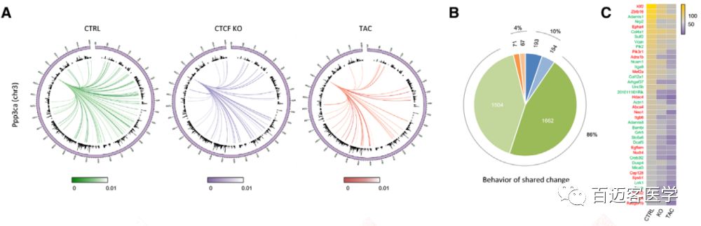 存在互作的9194個(gè)表達(dá)基因中,60%的基因在CTCF-KO和TAC中的互作變化方向相同。而剩余的40%基因中大多數(shù)(75%)是在某一組疾病細(xì)胞中虎作沒有發(fā)生變化的,25%是互作變化在兩組中相反的。在CTCF-KO和TAC中互作改變相同且差異表達(dá)的3651個(gè)基因中,絕大多數(shù)(86%)的局部互作減少(圖4B)。這些發(fā)現(xiàn)支持了這樣一種趨勢(shì),即更多的動(dòng)態(tài)染色質(zhì)互作影響基因表達(dá),兩組疾病細(xì)胞與對(duì)照相比,它們的基因表達(dá)變化方向更可能趨向一致?;プ鲾?shù)量top 40的差異表達(dá)基因在疾病細(xì)胞中的互作持續(xù)下降,如與鈣依賴信號(hào)和心肌肥厚相關(guān)的基因Ppp3ca。