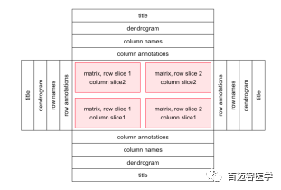 單個(gè)熱圖由熱圖主體和熱圖組件組成。 熱圖主體可以按行和列分割。 熱圖組件是標(biāo)題,樹形圖,矩陣名稱和熱圖注釋,它們放在heamap體的四個(gè)側(cè)面上。