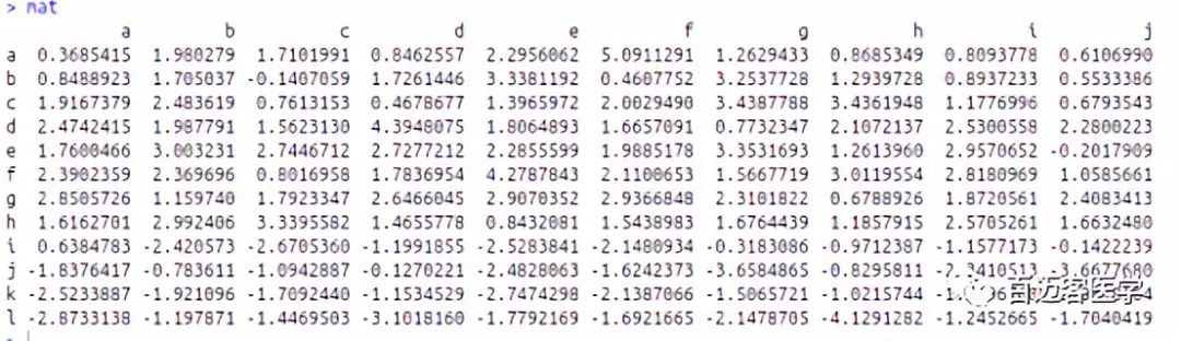 mat?=?matrix(rnorm(80,?2),?8,?10)?#產(chǎn)生一個(gè)8行10列共80個(gè)平均值是2的矩陣