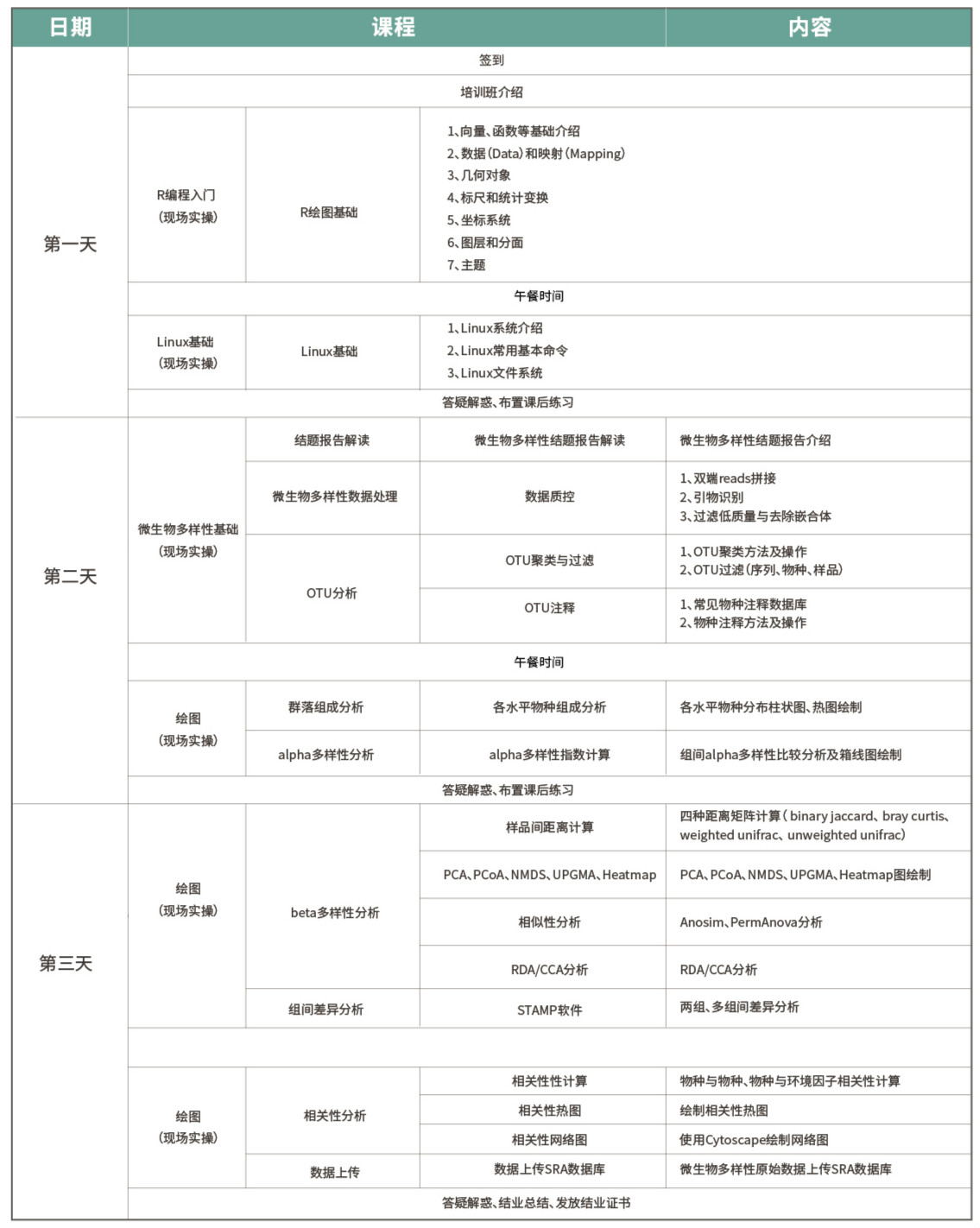 本次課程通過(guò)采用理論和實(shí)踐緊密結(jié)合的教學(xué)形式,以理論基礎(chǔ)至數(shù)據(jù)挖掘?qū)訉舆f進(jìn)的方式,讓大家在短時(shí)間內(nèi)對(duì)微生物研究中涉及的知識(shí)和方法得到迅速提升。同時(shí),在3天課程中,我們現(xiàn)場(chǎng)會(huì)有講師與助教與大家面對(duì)面的咨詢探討在研究思路、以及分析方面等遇到的問(wèn)題,從而在多元思維中幫助大家開(kāi)拓思路,挖掘微生物更多的價(jià)值。