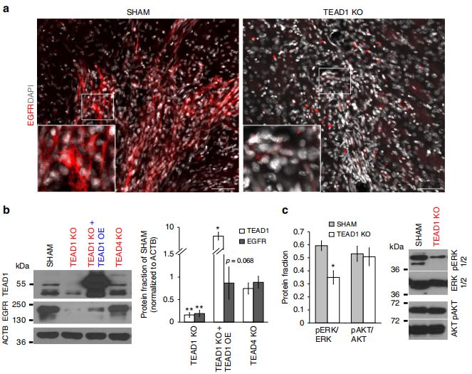 TEAD1KO異種移植樣本中EGFR的表達(dá)水平低于對(duì)照樣本,且TEAD1KO細(xì)胞系中EGFR表達(dá)相比于正常對(duì)照細(xì)胞系顯著下調(diào),TEAD1過表達(dá)后EGFR表達(dá)有回升。對(duì)EGFR下游信號(hào)元件的表達(dá)水平的檢測(cè)發(fā)現(xiàn),pERK在TEAD1KO細(xì)胞中下調(diào),而pAKT則不同。TEAD1KO細(xì)胞經(jīng)過較長(zhǎng)時(shí)間的培養(yǎng)后,EGFR表達(dá)恢復(fù),而遷移仍受影響。因此,TEAD1直接且短暫地調(diào)控EGFR。