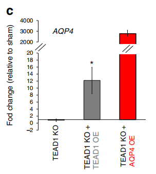 作者通過ATAC-seq和轉(zhuǎn)錄組測(cè)序數(shù)據(jù)篩選出來TEAD1的候選靶基因,并進(jìn)一步利用ChIP-PCR,驗(yàn)證了與TEAD1結(jié)合的靶基因–AQP4、EGFRCDH4。TEAD1敲除使AQP4下調(diào),TEAD1過表達(dá)可恢復(fù)AQP4的表達(dá),而TEAD1和AQP4過表達(dá)均可修復(fù)TEAD1KO細(xì)胞的遷移缺陷,說明TEAD1作用于靶基因AQP4,調(diào)控其表達(dá),進(jìn)而參與GBM遷移的直接調(diào)控機(jī)制。