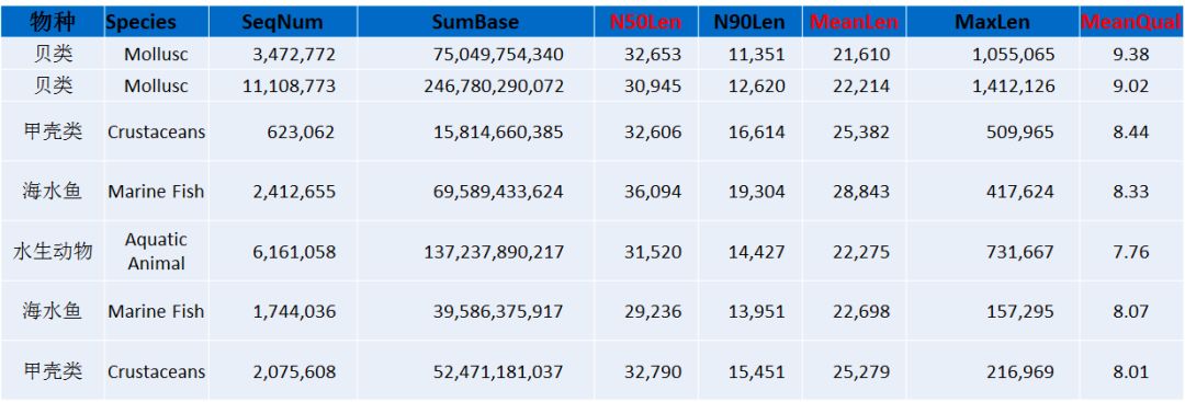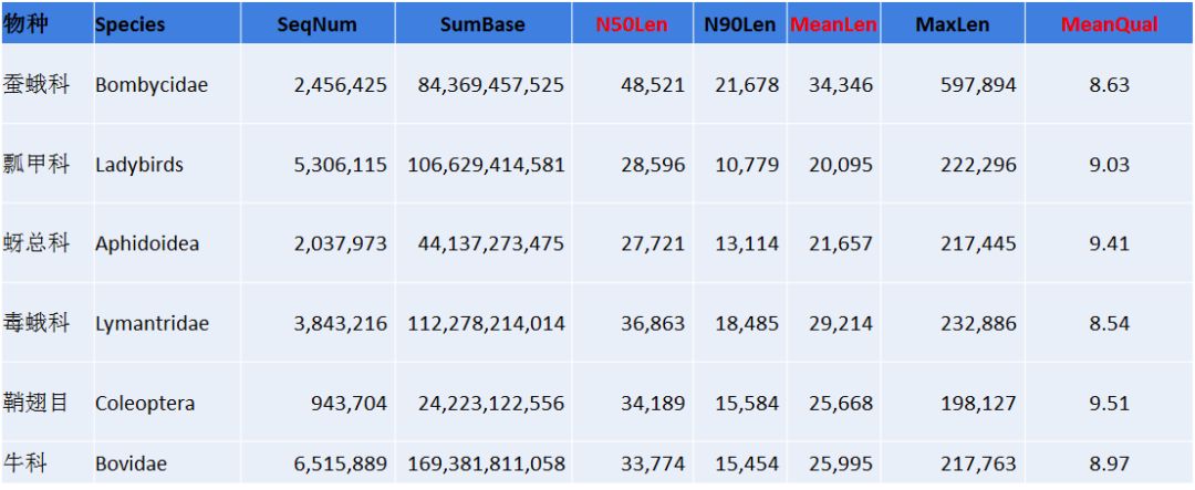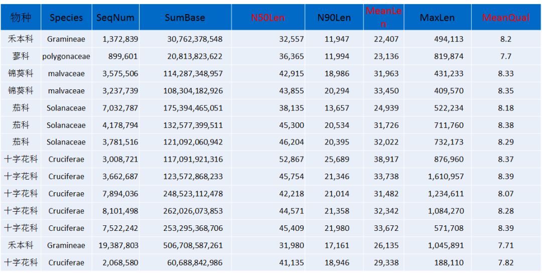 注:Species:分析的物種信息;SeqNum:各個(gè)長(zhǎng)度范圍內(nèi)序列的數(shù)目;SumBase:指各個(gè)長(zhǎng)度范圍內(nèi)序列的總長(zhǎng)度;N50Len:reads N50長(zhǎng)度;N90Len:readsN90長(zhǎng)度;MeanLen:平均reads長(zhǎng)度;MaxLen:最長(zhǎng)reads長(zhǎng)度;MeanQual:質(zhì)量值。