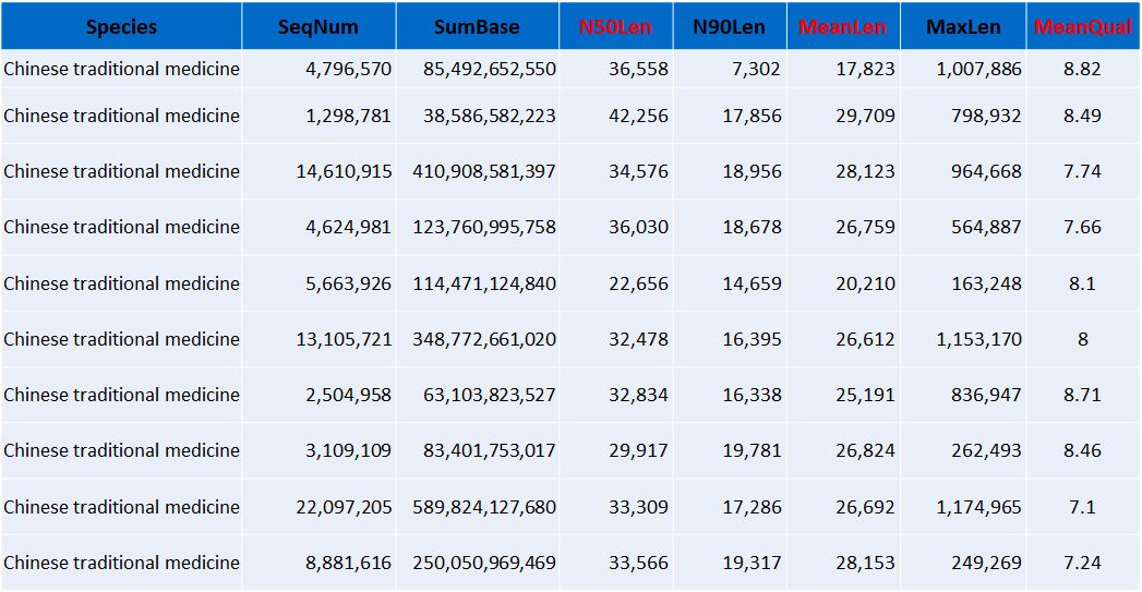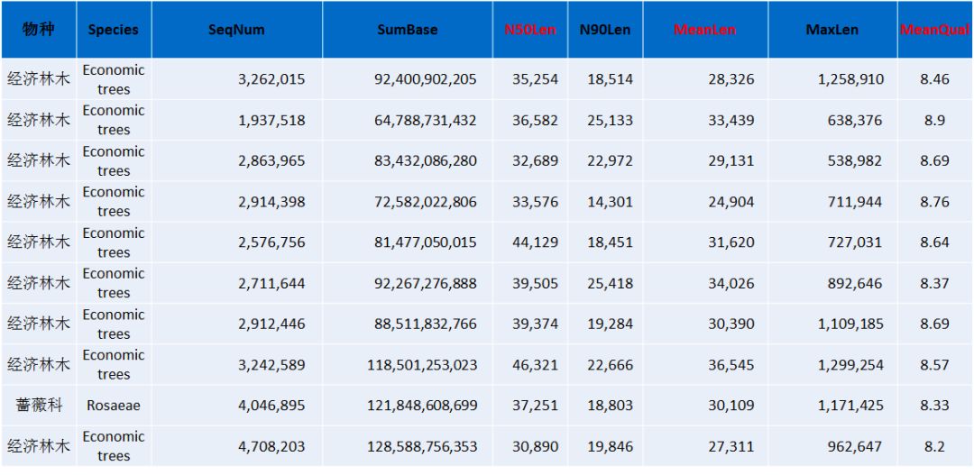 以上是總結(jié)的部分作物類、林木類、動(dòng)物、水產(chǎn)和中藥材的下機(jī)數(shù)據(jù)結(jié)果展示,從以上的數(shù)據(jù)不難看出,平均raeds長(zhǎng)度幾乎均在20Kb以上,最長(zhǎng)reads高達(dá)1.6Mb以上(不同樣品DNA抽提難易程度不同,會(huì)造成一定的影響)。